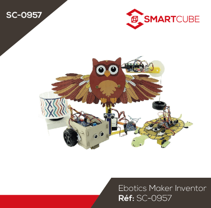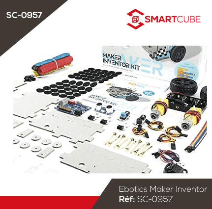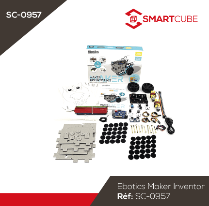 Le kit Maker Inventor est un kit électronique et programmation conçu pour permettre à l’utilisateur de construire et de programmer ses propres inventes. Comprend 5 projets et il est possible de créer des centaines d’inventions supplémentaires. Les 5 projets sont déjà programmés sur la carte Build & Code 4 en 1 pour fonctionner sans avoir à programmer. Le kit Maker Inventor comprend la plaque électronique 4 en 1 Build & Code qui, comme un cerveau, contrôle les composants électroniques selon les instructions programmées et donne vie aux différents inventeurs. Il est compatible avec Arduino et divers logiciels de programmation par bloc. Le kit Maker Inventor est conçu pour apprendre à programmer. La plaque Build&Code 4 en 1 a déjà programmée les 5 inventions incluses dans le kit, pour les faire fonctionner lorsque vous connectez la plaque, sans avoir à programmer. Une fois que l’utilisateur développera ses propres programmes, vous pouvez les enregistrer sur la carte Build&Code 4 en 1 et effacer les préenregistrés. Les inventions peuvent être contrôlées via un smartphone ou une tablette grâce à la connectivité Bluetooth.
